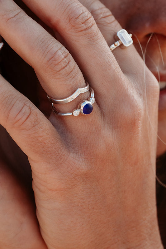 Blue Sea Glass Three Stone Silver Ring with Moissanite