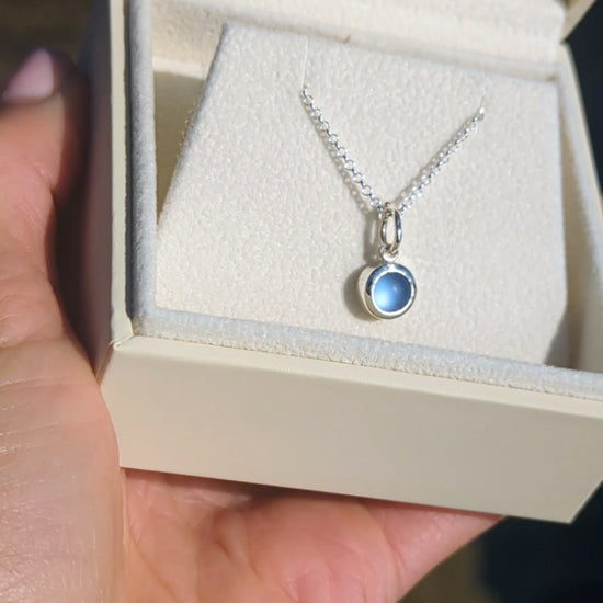 Handcrafted in my Newquay studio, this blue sea glass necklace is a delicate reminder of the ocean’s beauty. The vibrant piece of sea glass glows against its smooth sterling silver bezel, while the back is hand-stamped with my signature three bubbles – a playful detail inspired by the sea.