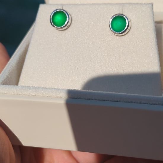 Handcrafted in my Newquay studio, these green sea glass stud earrings capture the fresh, glowing colours of the ocean. Each piece of sea glass is set in sterling silver with delicate bubble detail around the bezel – a subtle, playful touch that makes them unmistakably Booblinka.