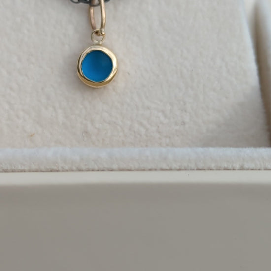 This one-of-a-kind necklace captures the wild beauty of the Cornish coast with a vibrant piece of ocean-found sea glass. The glowing blue gem is set in solid 9ct gold and suspended from a blackened sterling silver belcher chain, creating a striking contrast that feels both raw and refined.