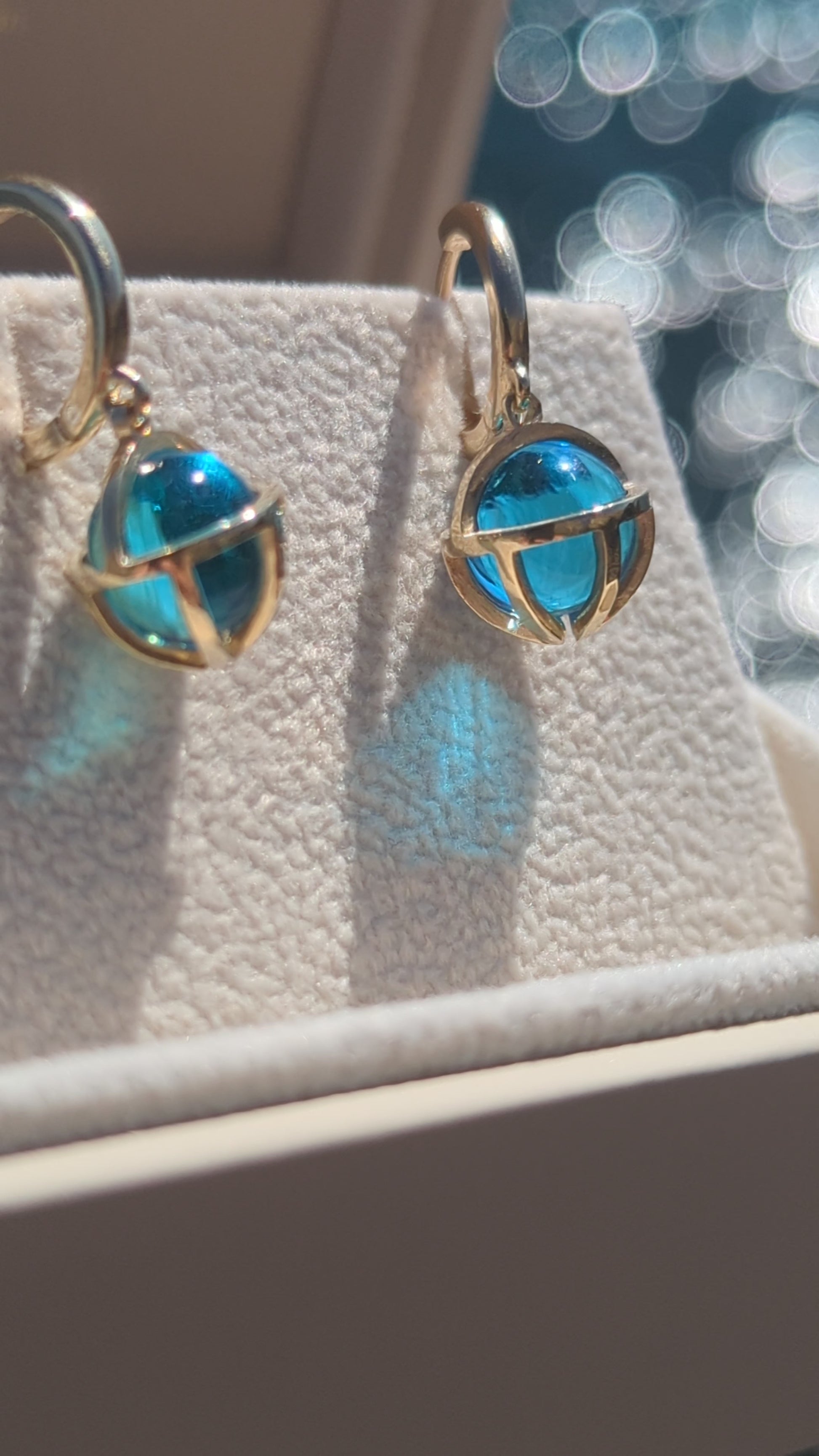 From my Drop of the Ocean Collection, these handmade gold hoop earrings feature glowing Swiss Blue Topaz spheres held in delicate 9ct gold cages.