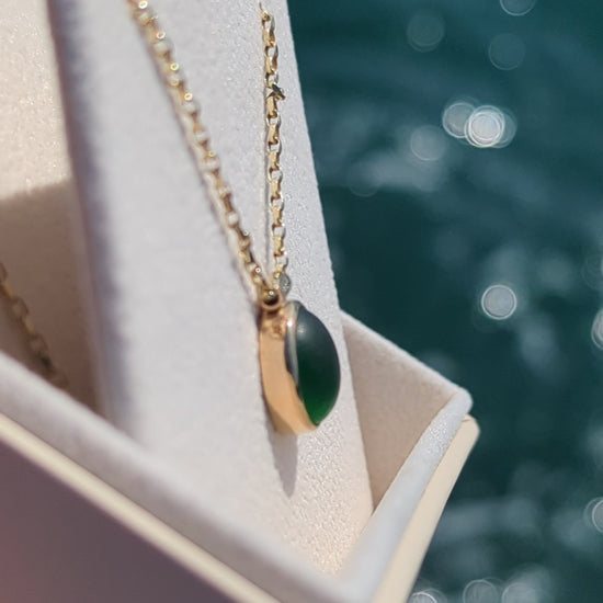 This handcrafted necklace features a glowing emerald green sea glass, tumbled by the waves and set in solid 9 carat recycled gold. Its rich colour, paired with a smooth gold bezel and a delicate granule accent, brings the feeling of the ocean to life — bold, timeless, and full of soul.