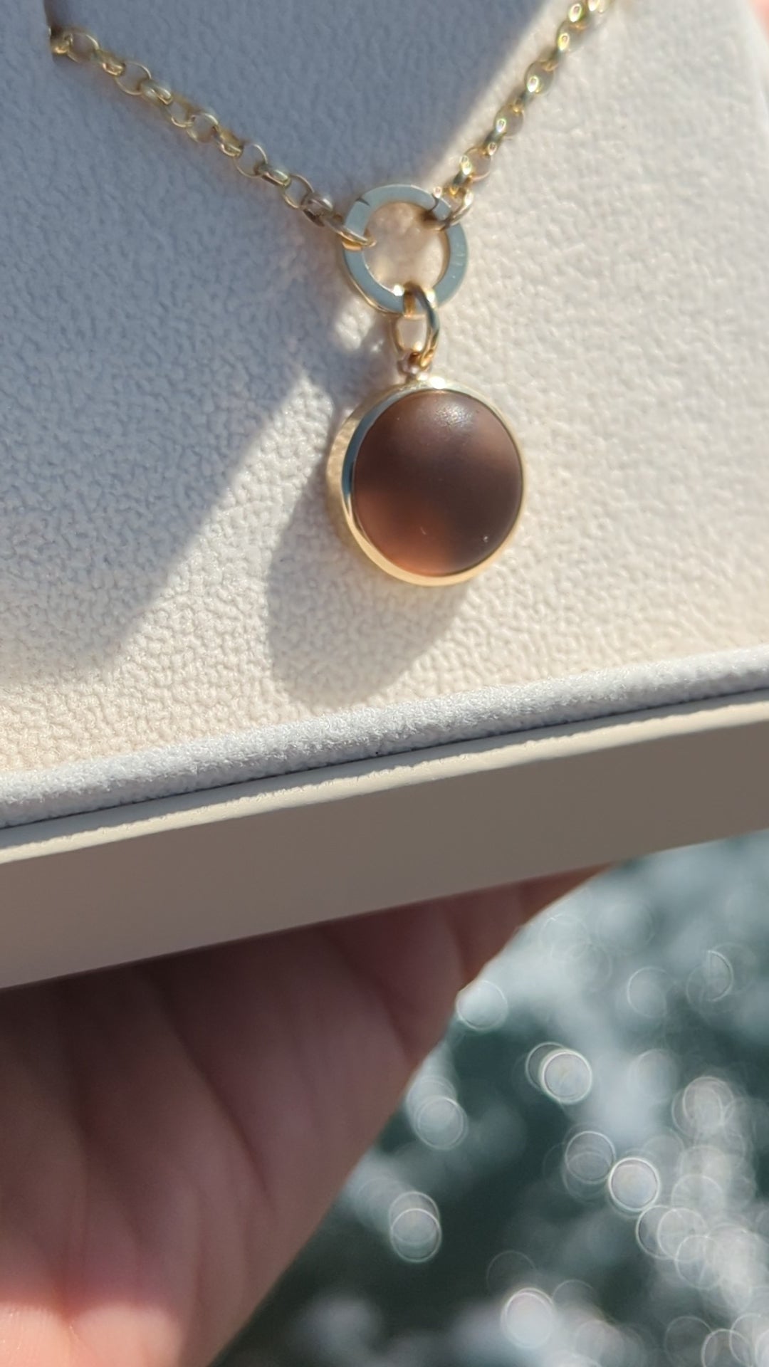 A one-of-a-kind solid gold necklace featuring rare mink brown sea glass, set in a round bezel with a unique three-ring back. Handmade in Cornwall.